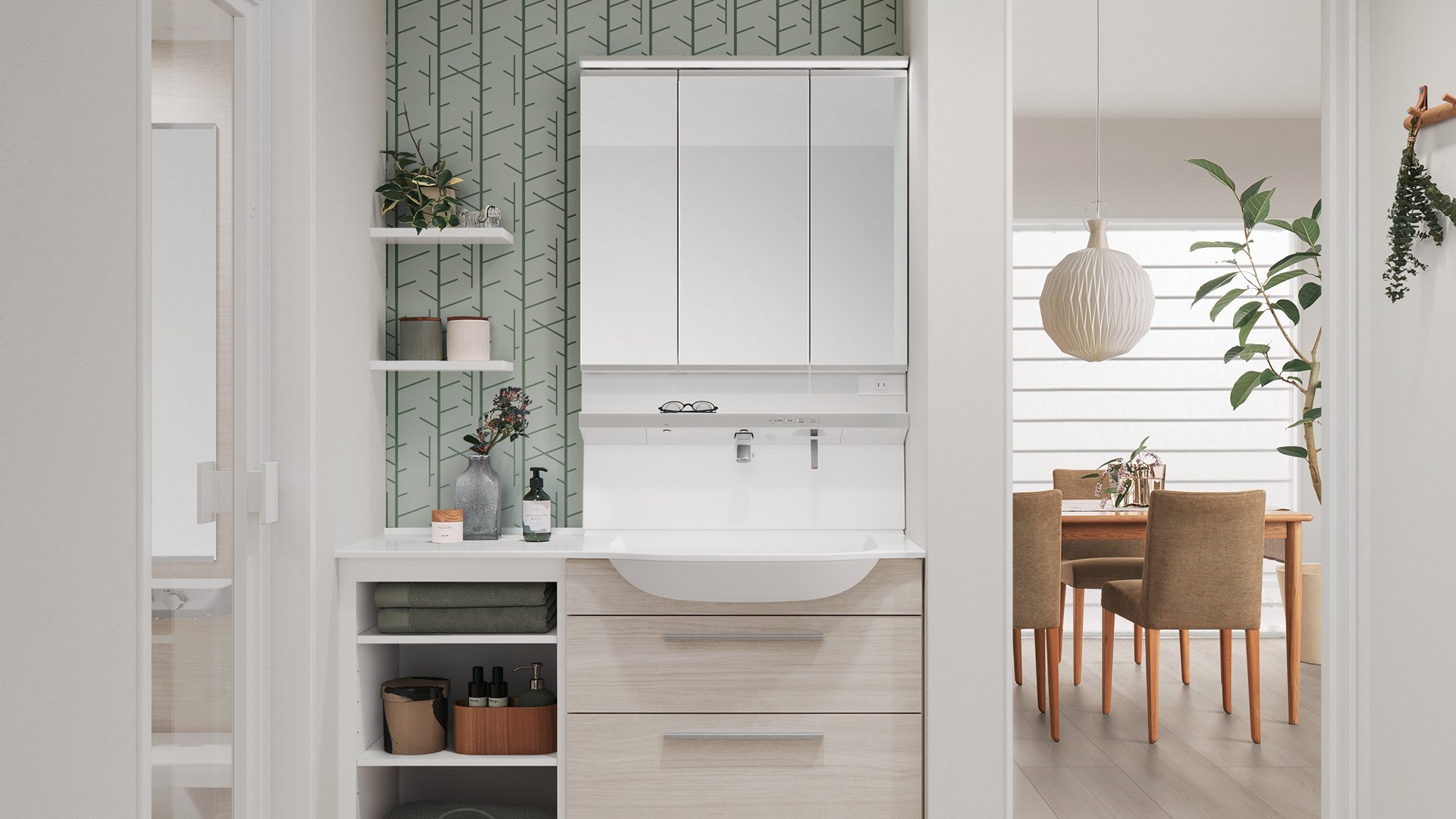 洗面化粧台周辺の各ゾーンごとに適したキャビネットを、豊富にご用意しています。